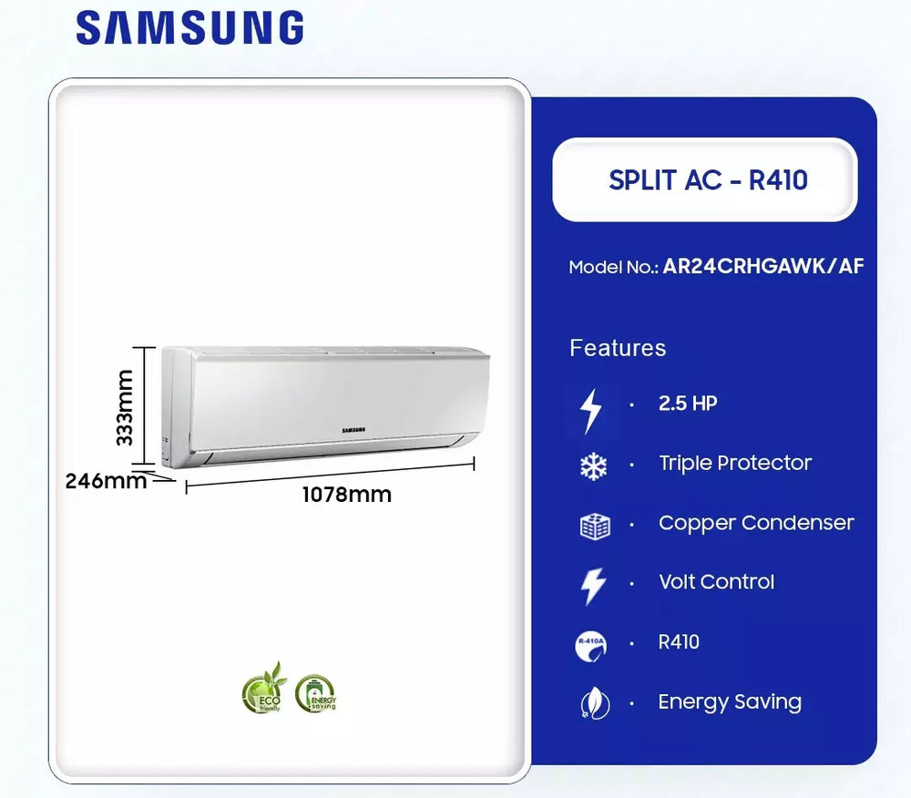 The Samsung 2.5HP R410 Split AC (Model AR24CRHGAWK/AF) is an air conditioning unit designed for both cooling and heating functions, typically aimed at larger rooms due to its 2.5 horsepower capacity. Below are some of the key features and specifications you might expect from a Samsung AC of this type: